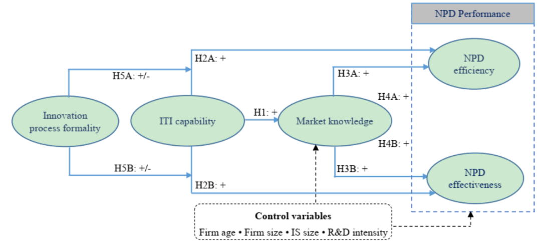 我们前期开展的文献分析和管理者访谈发现,目前关于ITI能力-NPD绩效 关系的研究在两个方面有所欠缺: 首先,根据知识基础观(KBV), 新产品开发反映了企业获取、整合、应用和创造新知识的能力(Zhou & Li, 2012)。然而,尽管现有文献强调了市场知识在NPD中的重要性(例如,Joshi & Sharma,2004;Luca & Atuahene-Gima,2007),但对市场知识在 ITI能力-NPD关系中的中介机制并没有深入探索。鉴于市场知识的战略意义以及一些实证研究发现ITI并不直接影响产品创新绩效(Ashrafi & Ravasan,2018),本文认为分析其在ITI能力-NPD绩效 关系中的中介作用似乎是合适的。这一论点也得到了现有文献的支持:既有研究发现ITI能力可以加强研发和其他职能部门之间的协调,增加NPD过程中的市场知识整合(Mauerhoefer等人,2017)。 其次,新产品开发本质上一个过程活动体系(例如,从概念生成、创意筛选、产品设计、原型制作、测试与验证,最后到商业化;见Cooper, 2017)。传统上,创新过程的特征(例如,制度化)被定位为NPD绩效的直接影响因素。然而,创新过程文献也指出,已有文献对于创新过程制度化如何提高新产品绩效并没有提供足够的答案(Chen等人,2010)。Goodale等人(2011年)验证了这一论点,他们使用177个NPD项目的真实数据,基于结构应急观点,发现推动NPD成功的关键因素并非创新过程本身,而是其与其他前因变量的整合和协同效应。 这些观点意味着,研究创新过程的制度化如何调节ITI能力对NPD绩效的影响是合理的。制度化的创新过程能够确保新产品开发活动遵守既定的规则和流程,并纠正与预期的偏差(Cooper,2017)。然而,过多的制度化也会阻碍NPD团队的学习和敏捷性。由于NPD过程涉及高度的复杂性和不确定性,在许多情况下,NPD团队需要非制度化的自主权来处理不可预见的情况(Bonner等人,2002)。 因此,基于上述分析,本论文考察了市场知识和创新过程的制度化对ITI能力-NPD绩效 关系的影响机制,试图通过研究以下三个问题来调和先前文献结论的不一致性:1)ITI能力对提高NPD绩效是否有益?如果是的话;2)市场知识在这种关系中是否发挥着中介作用?3)最后,创新过程的制度化在上述关系中发挥了何种程度(正向还是负向)的调节作用? 三、研究模型